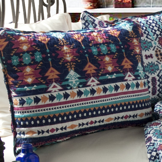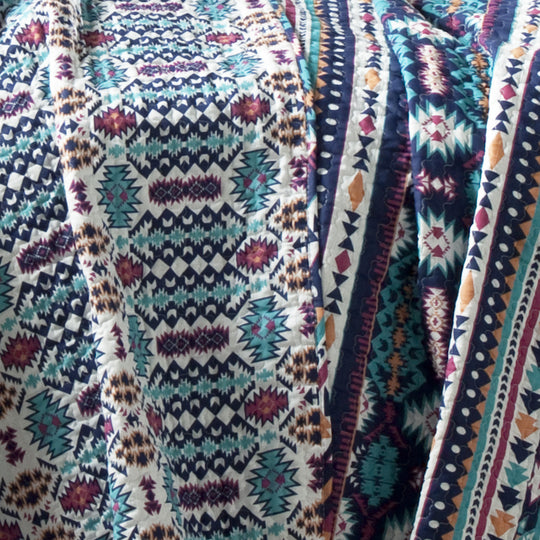This colorful Navajo 3Pc quilt features classic geometric patterns. The southwestern feel is created by the blue, orange and red color tones. The quilt has a complementary reverse. Imported
